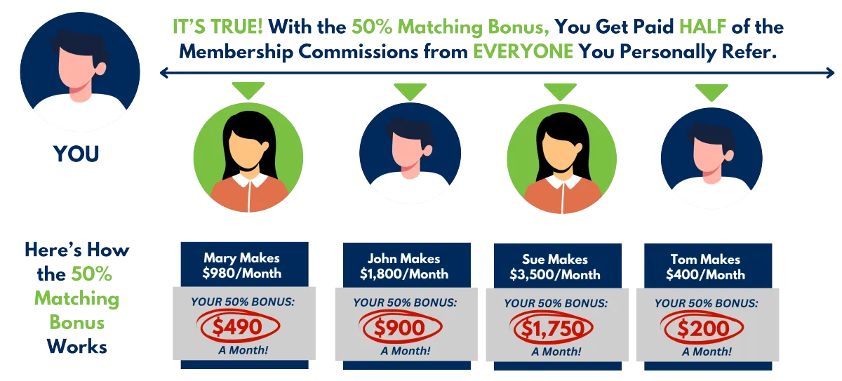 ā A 50% matching bonus on referral's residuals